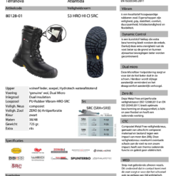 | Eigenschap | SB: safety basis, E: energie absorberende hak, A: antistatisch, PS: antiperforatie zool test 3mm, WPA: waterafstotend, WR: waterbestendigheid, FO: brandstof/olie bestendig, HRO: hittebestendige zool, HI: hitte isolerend, CI: koude isolerend, SC: kruipneus, SR: antislip zool |