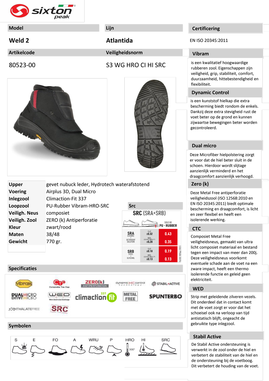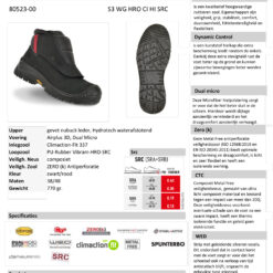 | Eigenschap | SB: safety basis, E: energie absorberende hak, A: antistatisch, PS: antiperforatie zool test 3mm, WPA: waterafstotend, FO: brandstof/olie bestendig, HRO: hittebestendige zool, HI: hitte isolerend, CI: koude isolerend, SC: kruipneus, SR: antislip zool |