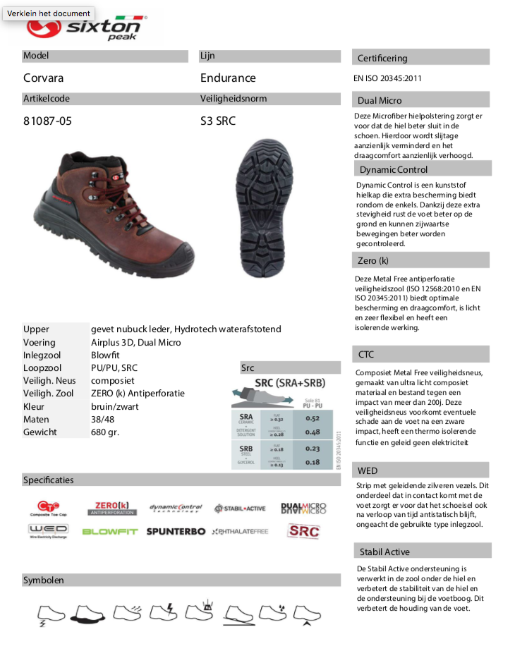 | Eigenschap | SB: safety basis, E: energie absorberende hak, A: antistatisch, PS: antiperforatie zool test 3mm, WPA: waterafstotend, FO: brandstof/olie bestendig, SC: kruipneus, SR: antislip zool |