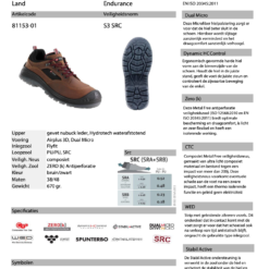 | Eigenschap | SB: safety basis, E: energie absorberende hak, A: antistatisch, PS: antiperforatie zool test 3mm, WPA: waterafstotend, FO: brandstof/olie bestendig, SC: kruipneus, SR: antislip zool |