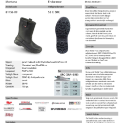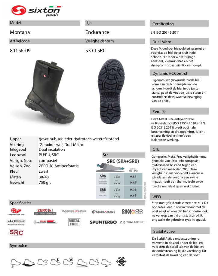 Deze werklaars van het merk Sixton Peak is gemaakt van gevet, waterafstotend nubuck leer. Deze laars heeft een voering van echt lamswol. Tevens is de laars voorzien van een ultralichte C.T.C. composiet veiligheidsneus, een metaalvrije lenzi 1400N veiligheidszool. Een PU/PU sterke flexibele zool met hoge SRC antislipnorm en een inlegzool van vilt met ali voating tegen de kou die tevens anatmisch, hygiënisch, antistatisch en absorberend is.