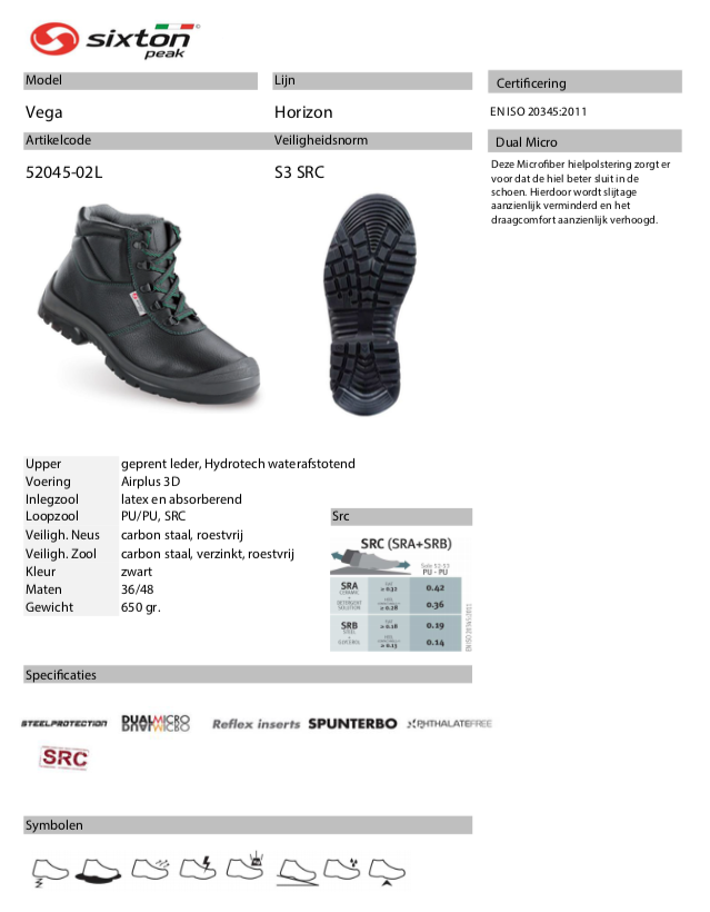 | Eigenschap | SB: safety basis, E: energie absorberende hak, A: antistatisch, P: metalen antiperforatie zool, WPA: waterafstotend, FO: brandstof/olie bestendig, SC: kruipneus, SR: antislip zool |