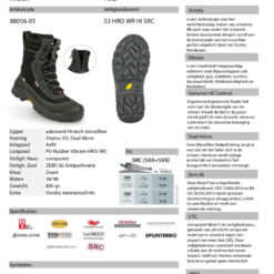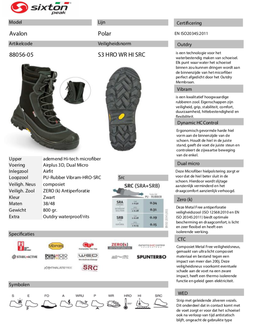 | Eigenschap | SB: safety basis, E: energie absorberende hak, A: antistatisch, PS: antiperforatie zool test 3mm, WPA: waterafstotend, WR: waterbestendigheid, FO: brandstof/olie bestendig, HRO: hittebestendige zool, HI: hitte isolerend, SC: kruipneus, SR: antislip zool |