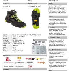 | Eigenschap | SB: safety basis, E: energie absorberende hak, A: antistatisch, PS: antiperforatie zool test 3mm, WPA: waterafstotend, WR: waterbestendigheid, FO: brandstof/olie bestendig, SC: kruipneus, SR: antislip zool |