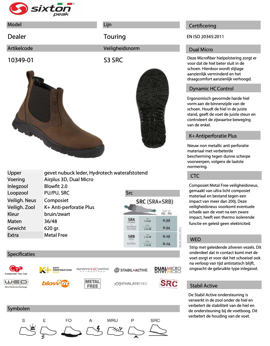 | Eigenschap | SB: safety basis, E: energie absorberende hak, A: antistatisch, PS: antiperforatie zool test 3mm, WPA: waterafstotend, FO: brandstof/olie bestendig, SR: antislip zool |
