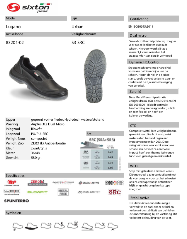 | Eigenschap | SB: safety basis, E: energie absorberende hak, A: antistatisch, PS: antiperforatie zool test 3mm, WPA: waterafstotend, FO: brandstof/olie bestendig, SC: kruipneus, SR: antislip zool |