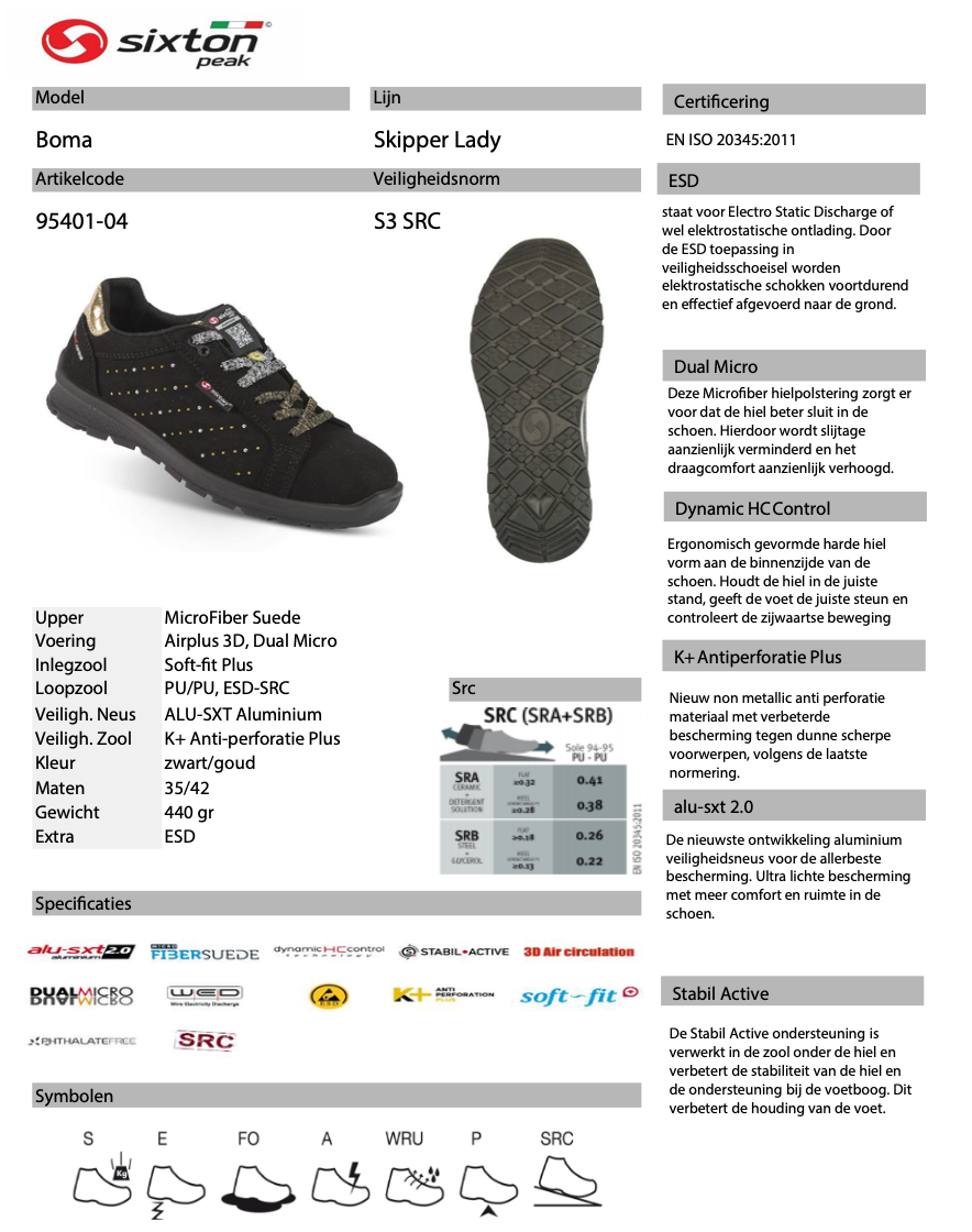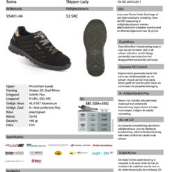 | Eigenschap | SB: safety basis, E: energie absorberende hak, A: antistatisch, PS: antiperforatie zool test 3mm, WPA: waterafstotend, FO: brandstof/olie bestendig, SR: antislip zool |